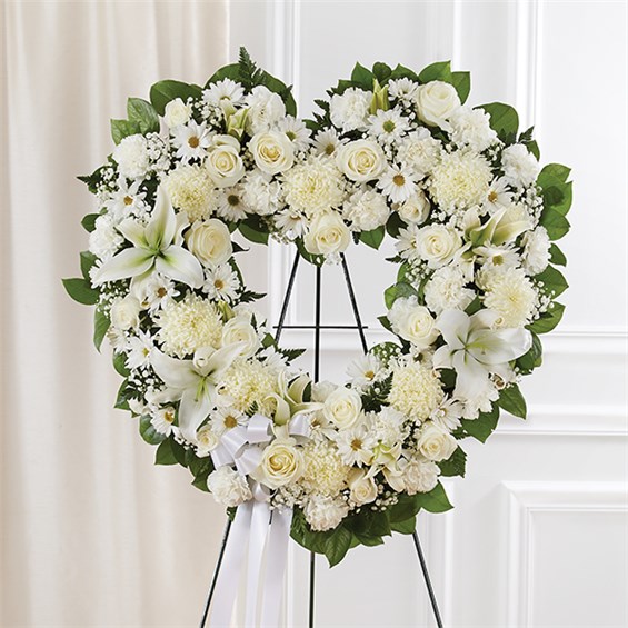The enduring love you feel for them will keep them always remembered. This sentiment is best captured with our standing, open heart-shaped arrangement in all white. Handcrafted by our caring florists with an assortment of flawless white blooms, it is a magnificent tribute fitting for the funeral services.