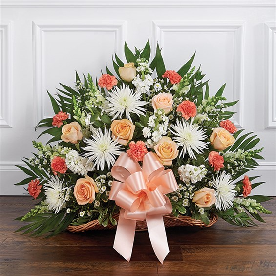 They drew people in with their warm smile and exuberant spirit. These are the qualities we remember most, the ones we want to honor. Our fireside basket arrangement, hand-designed by expert florists with a splay of peach, orange and white blooms, captures this thoughtful sentiment in a grand display, beautifully suited for the funeral or gravesite.
